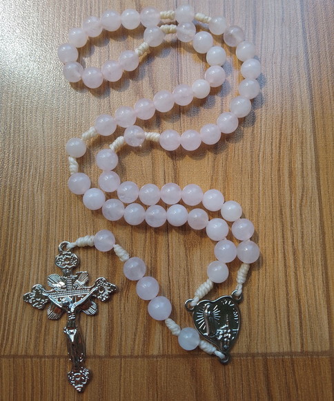 Lindo Terço Mariano confeccionado com pedra natural Quartzo Rosa,entremeio e crucifixo em metal níquele ouro velho